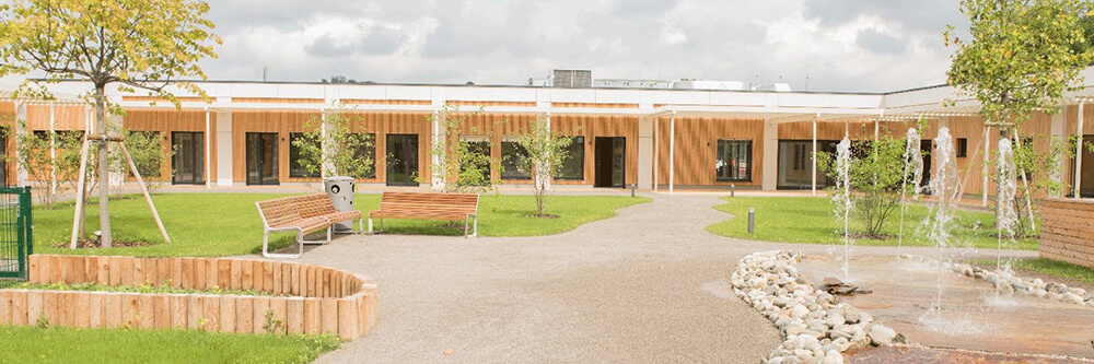 Unsere elf Zimmer im Hilde Umdasch Haus sind barrierefrei und verfügen über eigene Bäder und eigene Terrassen mit einem direkten Zugang zum Garten, welcher sehr großzügig angelegt ist und zum Erholen einlädt. Hier befindet sich ein Spielplatz mit einem in den Boden eingelassenen Trampolin, das es bewegungseingeschränkten Kindern ermöglicht, einfach auf die Springfläche zu gelangen.